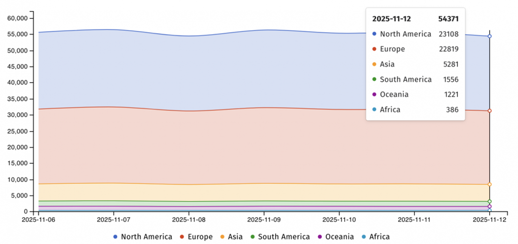 Although WatchGuard issued patches to fix this flaw on September 17, the company only confirmed the exploitability of the vulnerability nearly a month later, on October 21. Prior to this confirmation, security researchers from ShadowServer reported tracking over 75,000 vulnerable Firebox devices worldwide. Recent data shows that the number of exposed appliances has decreased to just over 54,000, with the majority located across Europe and North America, reflecting ongoing efforts to mitigate the threat.
