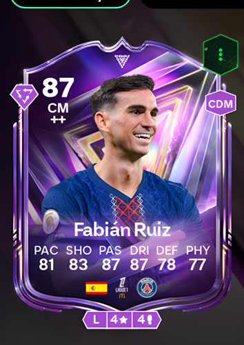 Fabián Ruiz Peña's FC Pro card presents an elite 87-rated Center Midfielder, boasting a well-rounded and technically superb statistical profile. With standout 87 ratings in both passing and dribbling, complemented by a solid 83 in shooting and 81 in pace, this card excels as a complete midfield orchestrator. The advantages of deploying Fabián in the center of the park are clear: his exceptional vision and pinpoint distribution allow him to dictate the tempo and unlock defenses with incisive through balls, while his close control and agility enable him to glide past opponents and transition play seamlessly from defense to a decisive attacking opportunity.