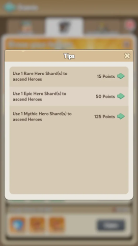 For each rare hero shard used to ascend a hero, you will earn 15 points.