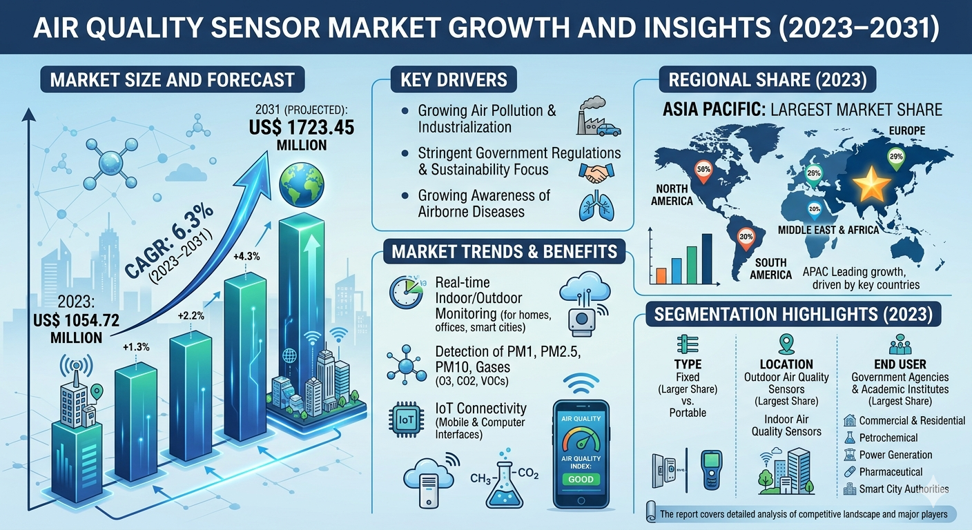The Air Quality Sensor Market Insights is steadily expanding as environmental monitoring becomes a critical priority worldwide. According to industry estimates, the market size is projected to increase from US$ 1054.72 million in 2023 to US$ 1723.45 million by 2031, registering a CAGR of 6.3% during 2023–2031. Rising environmental regulations, growing awareness of the health impacts of air pollution, and increasing integration of smart technologies are supporting the expansion of sensor-based monitoring systems. As governments and industries strengthen pollution control initiatives, the adoption of advanced air monitoring technologies is expected to grow consistently during the forecast period.