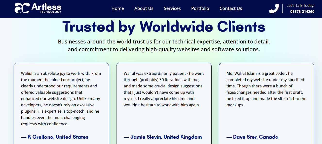 From discovery and planning to development, deployment, and ongoing support, Artless Technology ensures every project is built with performance, security, and future growth in mind.