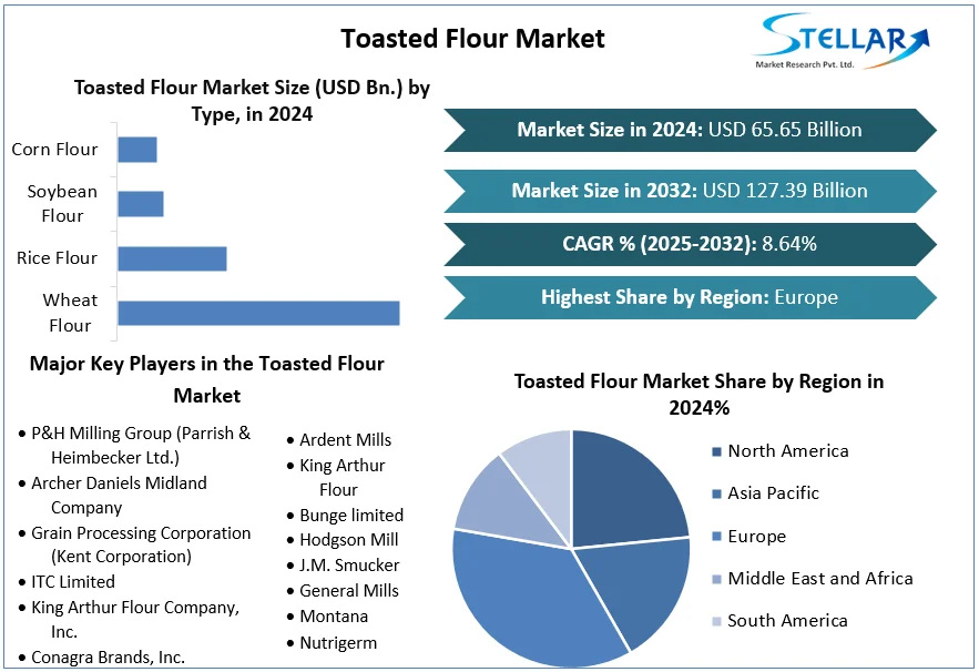 Toasted Flour market Size was valued at USD 65.65 Billion in 2024. The market is expected to grow at a CAGR of 8.64% during the forecast period of 2025-2032 reaching nearly USD 127.39 Billion by 2032.