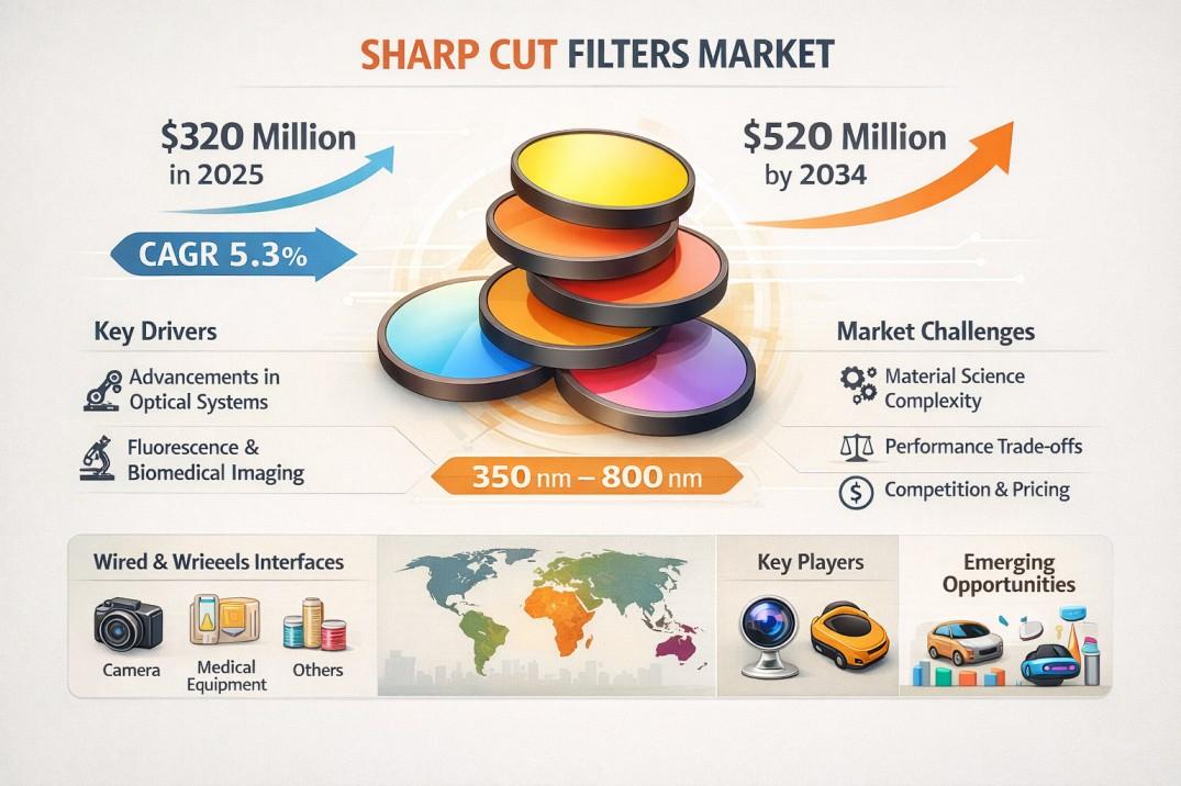 According to a new report from Intel Market Research, the global Sharp Cut Filters market was valued at USD 320 million in 2025 and is projected to grow from USD 345 million in 2026 to USD 520 million by 2034, exhibiting a CAGR of 5.3% during the forecast period (2026–2034). This growth is propelled by increasing adoption in medical imaging equipment and industrial inspection systems where accurate color separation is essential, alongside steady demand from scientific instrumentation and emerging opportunities in autonomous vehicle sensors and augmented reality displays.