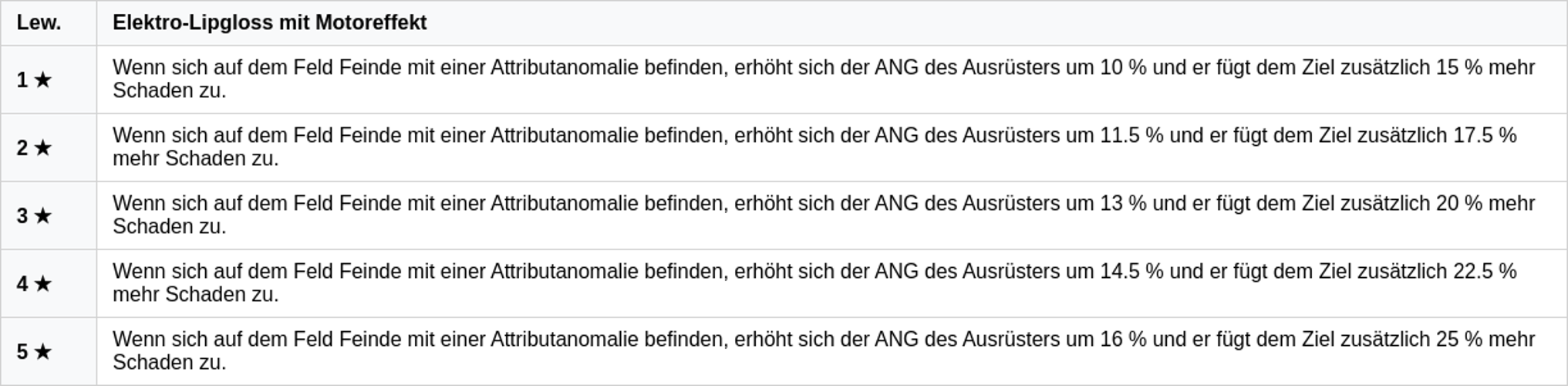 Grundwerte: erhöht den Grundangriff sowie die Effektivität von Anomalie-Fähigkeiten; die Boni wachsen mit der Verfeinerungsstufe.\n