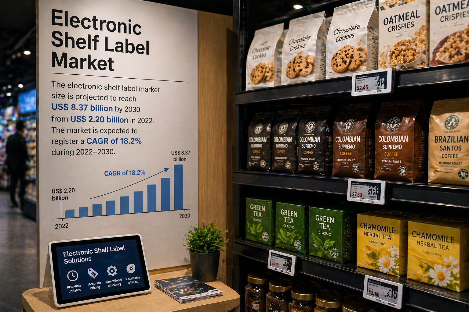 According to the Electronic Shelf Label Market Analysis, the global Electronic Shelf Label Market is experiencing rapid growth due to rising adoption in the retail sector. The market is projected to grow from US$ 2.20 billion in 2022 to US$ 8.37 billion by 2030, registering a CAGR of 18.2% during the forecast period. This growth is driven by increasing demand for automation solutions and the need for efficient pricing management systems in modern retail environments.