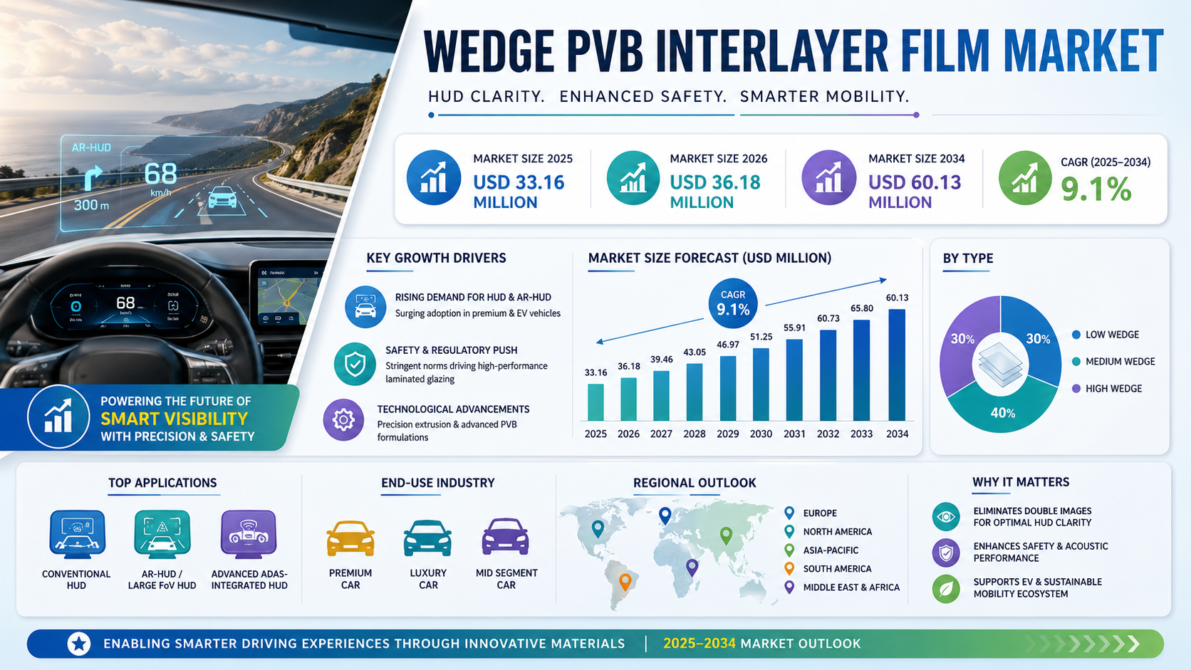 According to a new report from Intel Market Research, the global Wedge PVB Interlayer Film market was valued at USD 33.16 million in 2025 and is projected to grow from USD 36.18 million in 2026 to reach USD 60.13 million by 2034, exhibiting a robust CAGR of 9.1% during the forecast period (2025–2034). This growth is propelled by surging demand for heads-up display (HUD) and augmented-reality HUD (AR-HUD) systems in premium and luxury vehicles, the accelerating transition toward electric vehicles and smart cockpits, and evolving regulatory standards that mandate high-performance laminated glazing technologies.