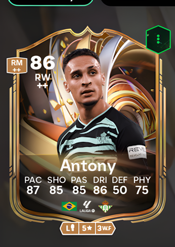 Antony Matheus dos Santos’s Ratings Reload card arrives as an electrifying Right Wing option, boasting an impressive overall rating of 86. With standout attributes such as 87 pace, 85 shooting, 85 passing, and 86 dribbling, this card is tailor-made for players seeking a dynamic and incisive attacker. Antony’s combination of speed and technical finesse enables him to burst down the flank, outmaneuver defenders, and create or convert scoring opportunities with ease. As a sharp attacking winger, he is perfectly positioned to break through opposition defenses, making him a game-changing asset capable of turning tight matches in your favor.
