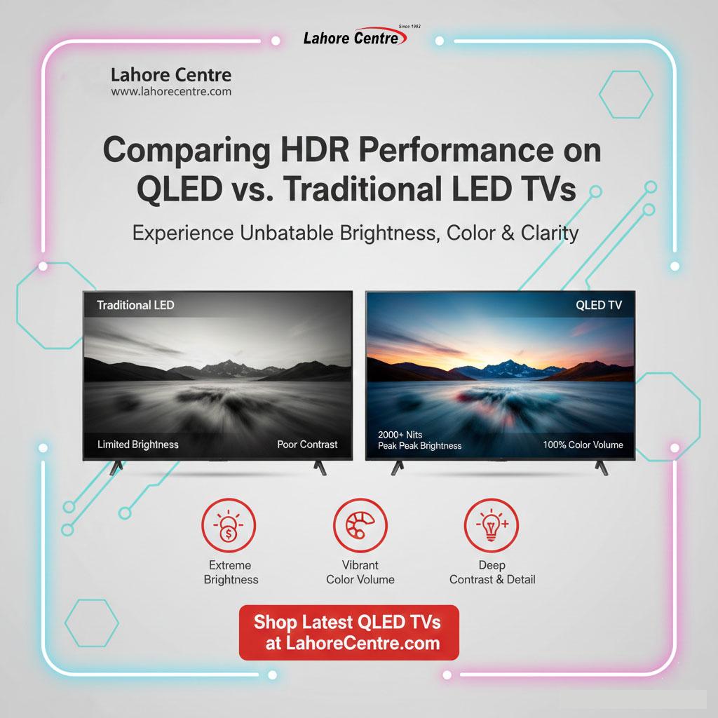 Compare HDR performance on QLED vs. traditional LED TVs. Discover how quantum dots enhance brightness and color for a cinematic experience at Lahore Centre.
