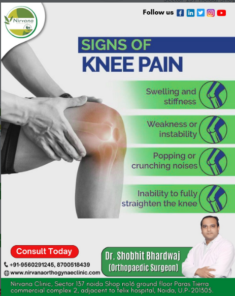 Visit our clinic: Sector 137 Noida, Shop no16 ground floor, Paras Tierra commercial complex 2(adjacent to Felix hospital), Noida, Uttar Pradesh 201305WARNING SIGNS OF KNEE PAIN YOU SHOULD NOT IGNORE 🦵 Knee pain can affect your mobility and daily activities if ignored for too long. Recognizing the early signs can help you get the right treatment before the condition worsens. Common signs of knee problems include: ✔ Swelling and stiffness ✔ Weakness or instability in the knee ✔ Popping or crunching sounds while moving ✔ Difficulty or inability to fully straighten the knee 👨⚕️ Consult Dr. Shobhit Bhardwaj (Orthopaedic Surgeon) 📞 +91-9560291245, 8700518439 📍 Nirvana Clinic, Sector 137, Noida 👨⚕️ Consult Dr. Shobhit Bhardwaj, Best orthopaedic doctor Sector 137 Noida 📍 Visit: nirvanaorthogynaecclinic.com 📞 Book your consultation today: 9560291245 | 8700518439 📍 Visit our clinic: Sector 137 Noida, Shop no16 ground floor, Paras Tierra commercial complex 2(adjacent to Felix hospital), Noida, Uttar Pradesh 201305·2 Views ·0 Anteprima