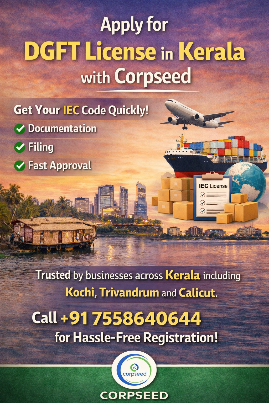 Looking for DGFT License in Kerala? Corpseed offers expert guidance, quick IEC registration, and complete support for import-export licensing. Trusted across Kerala. Call +91 7558640644 today to get started!