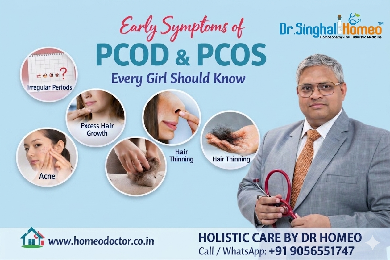 Polycystic Ovary Syndrome and Polycystic Ovarian Disease are common hormonal disorders affecting women in their reproductive years. Early symptoms include irregular periods, acne, weight gain, excess hair growth, and hair thinning. Some may also face mood swings and fertility issues. Recognizing these signs early is important for proper care. At Dr. Singhal Homeo, a natural and holistic approach helps manage symptoms and support hormonal balance effectively.