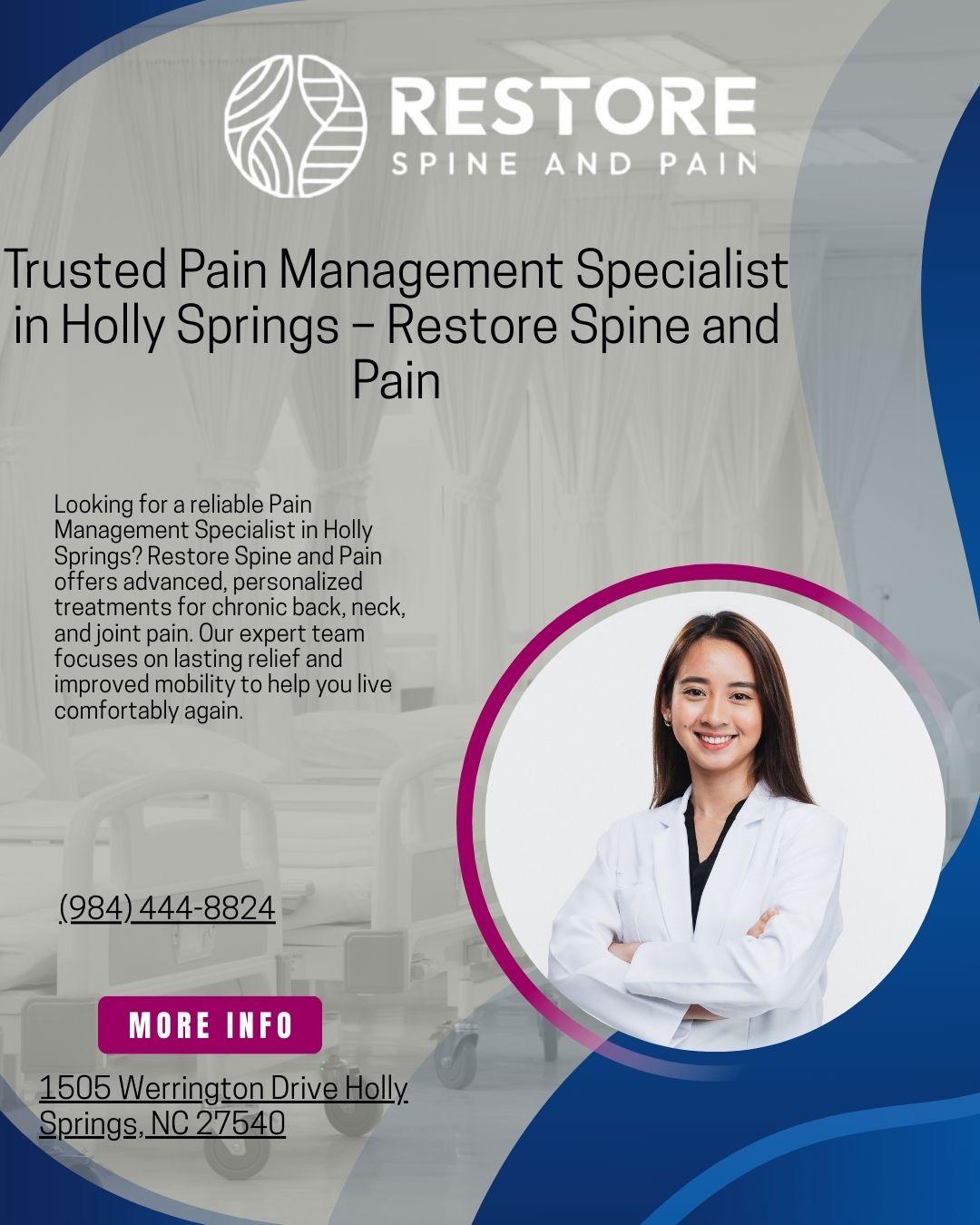 Looking for a reliable Pain Management Specialist in Holly Springs? Restore Spine and Pain offers advanced, personalized treatments for chronic back, neck, and joint pain. Our expert team focuses on lasting relief and improved mobility to help you live comfortably again.