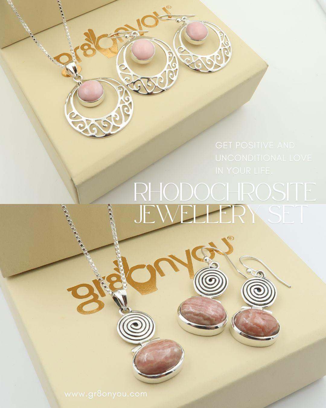 Discover timeless elegance with the Rhodochrosite Jewellery Set, beautifully handcrafted to perfection by gr8onyou. Designed in premium 925 sterling silver, this exquisite silver jewellery set blends natural gemstone charm with refined craftsmanship, making it ideal for special occasions or graceful everyday wear.